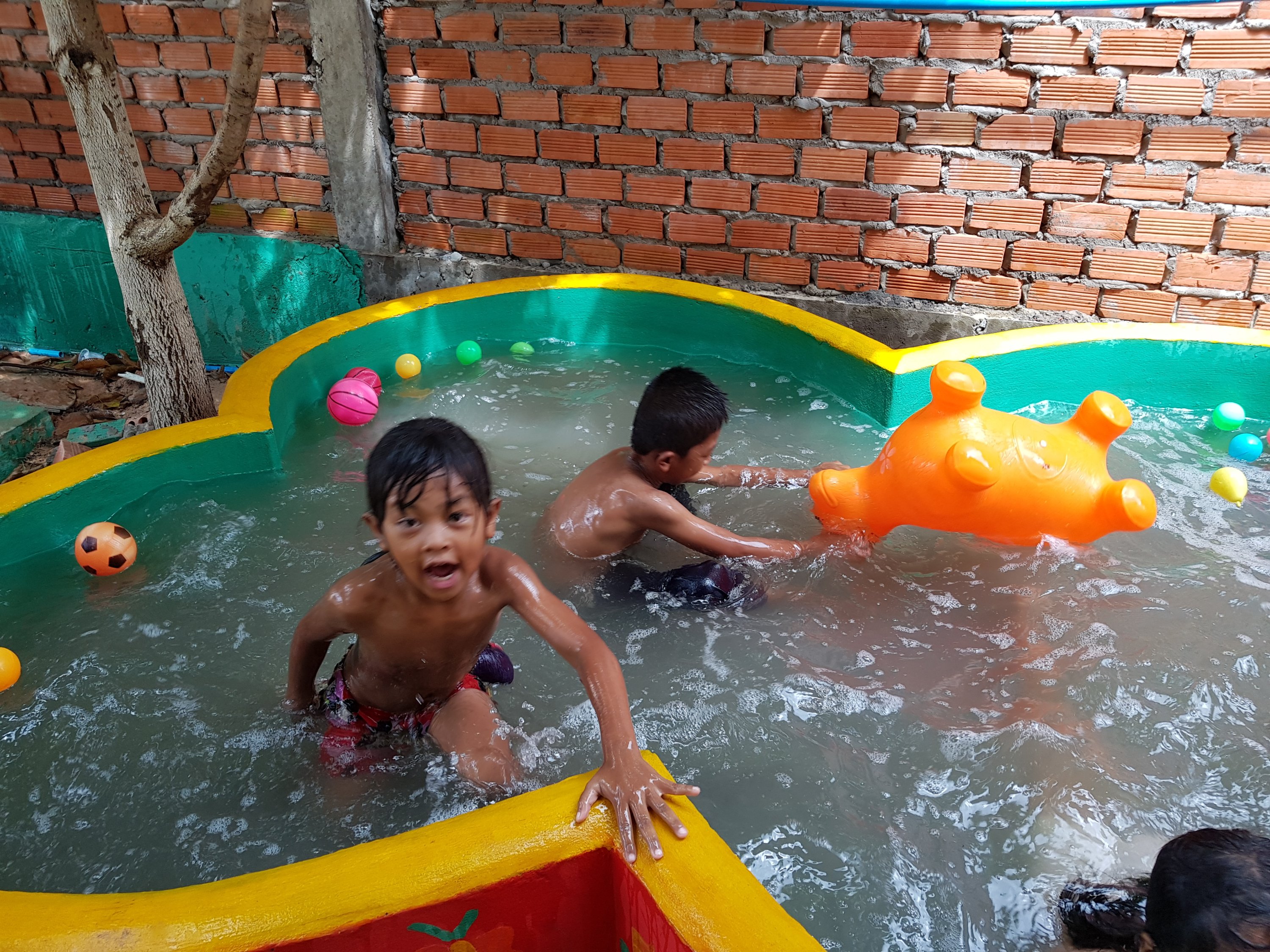 When we started the lesson it went “A for apple, B for baby” the children reeled it off parrot fashion, with no comprehension at all. Suggested she tried it phonetically which lasted for about 20 mins. I handed out the microphones I had taken in and suggested that she got them working in pairs to keep them all occupied….didnt go down well. So we had a 3-hour lunch break when we enjoyed really good home cooking and a lesson from the head on how to speak Khmer, afraid in one ear and out the other. Some children stayed in school over lunch and made use of the little pool that had been built by previous volunteers. l